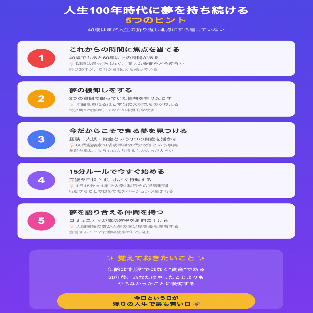 ここまで、年齢に関係なく夢を持ち続けるための5つのヒントをお伝えしました。