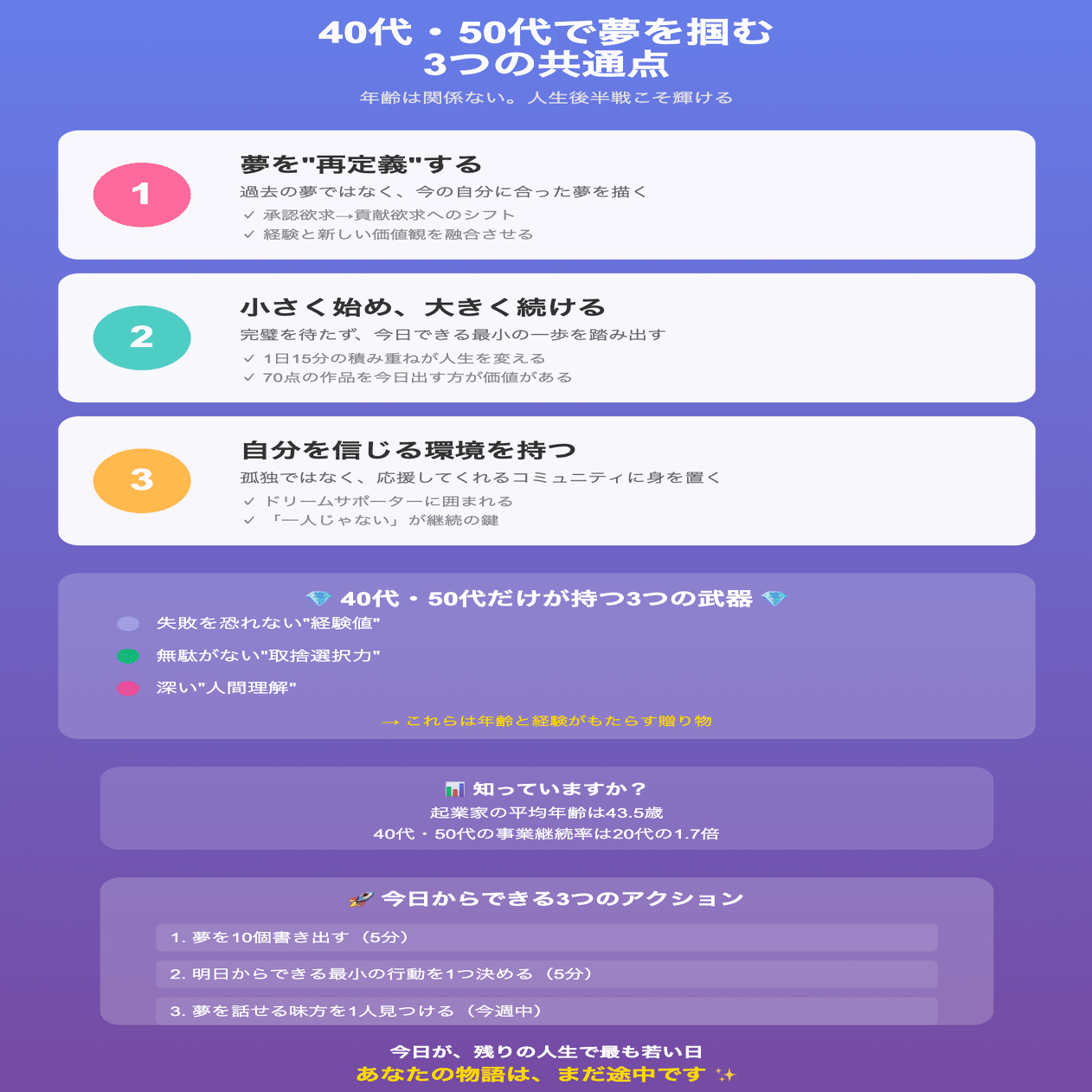 この記事では、40代・50代で夢を掴んだ人たちの「意外すぎる共通点」を徹底解剖。人生100年時代と言われる今、あなたの人生後半戦を最高に輝かせるヒントをお届けします。