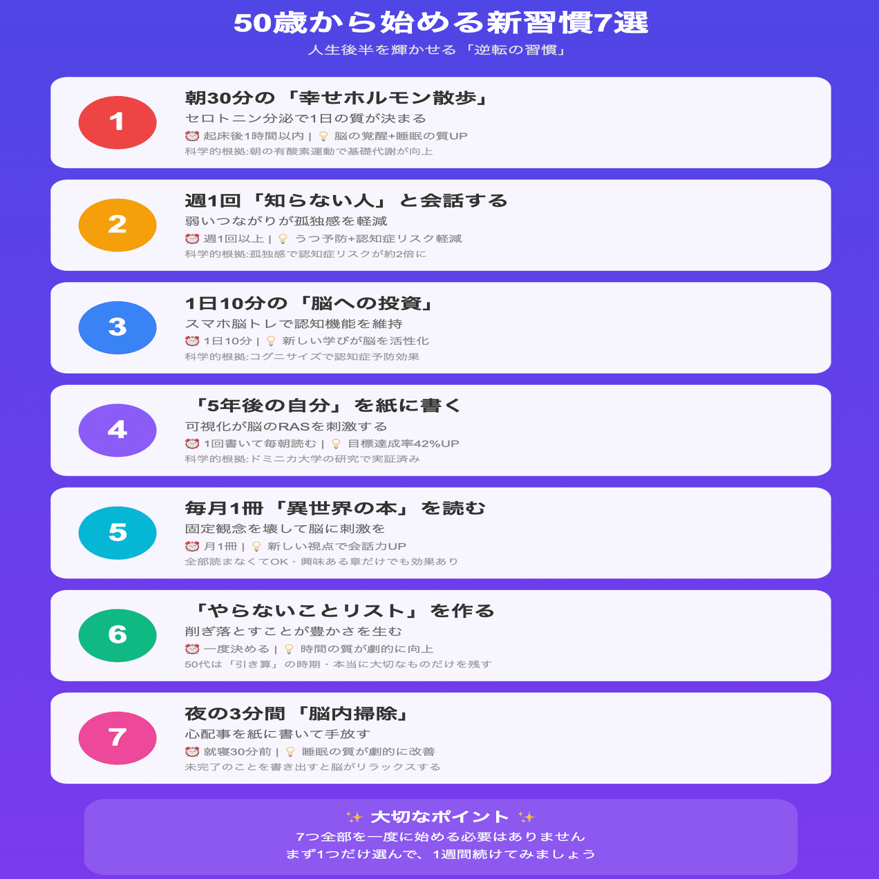 今回は、科学的な研究データと実例をもとに、「50歳からでも遅くない!」と自信を持っておすすめできる7つの新習慣をご紹介します。