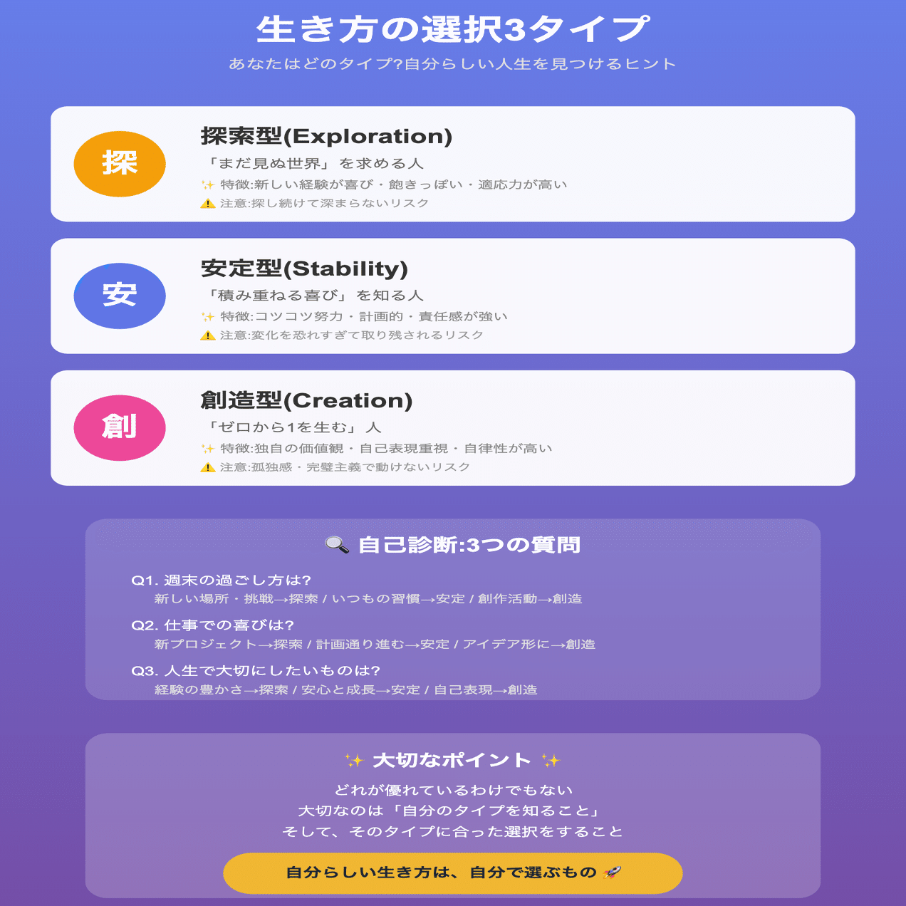 探索型、安定型、創造型。どれが優れているわけでもなく、どれが間違っているわけでもありません。大切なのは、自分のタイプを理解し、そのタイプに沿った選択をすることです。