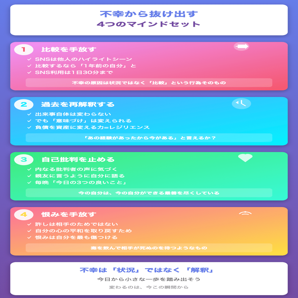ここまで、不幸から抜け出すための4つの視点をお伝えしてきました。