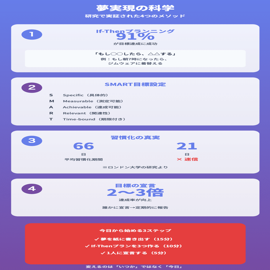 今日お伝えするのは、ニューヨーク大学やロンドン大学などの一流研究機関が実証した、科学的な夢実現メソッドです。これを実践した人の91%が目標を達成したという、驚くべき研究結果も出ています。