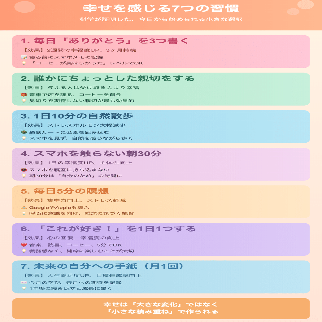 つまり、幸せは「いつか手に入れるもの」ではなく、「今日から作り出せるもの」。そして、その方法は驚くほどシンプルなのです。