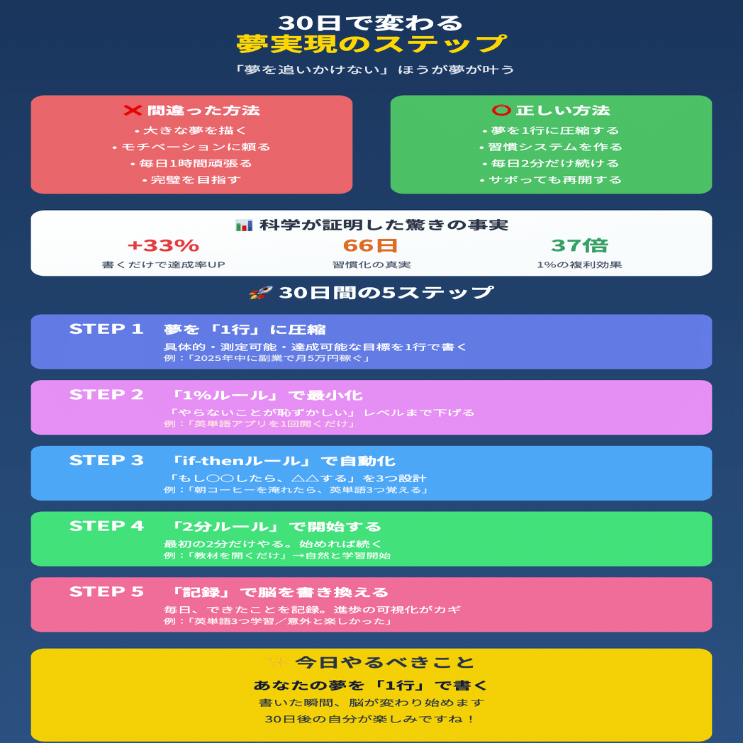1日目:目標を「3ヶ月で短編小説1本を完成させる」に設定 2-3日目:習慣を「朝コーヒーを飲みながら、50文字だけ書く」に設計 4-7日目:「if-thenルール」で「朝コーヒーを淹れたら、パソコンを開く」 8-14日目:「2分ルール」で「パソコンを開いてメモ帳を起動する」まで下げる 15-30日目:毎日、書いた文字数と気づきを記録