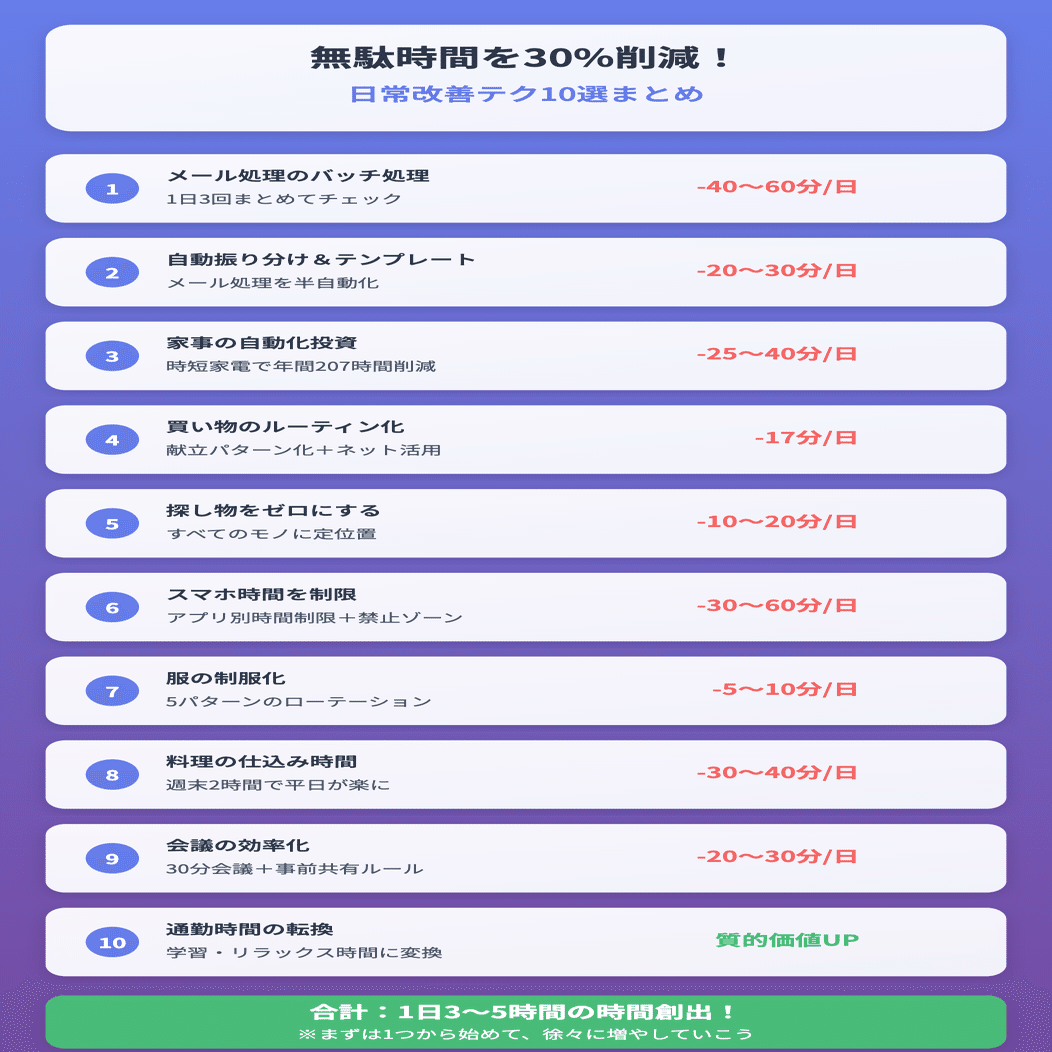 今回ご紹介する10のテクニックは、すべて今日から実践できる具体的な方法ばかり。「えっ、こんな簡単なことで?」と驚くものから、「もっと早く知りたかった!」と後悔するものまで、あなたの時間を取り戻す実践的な改善策をお届けします。