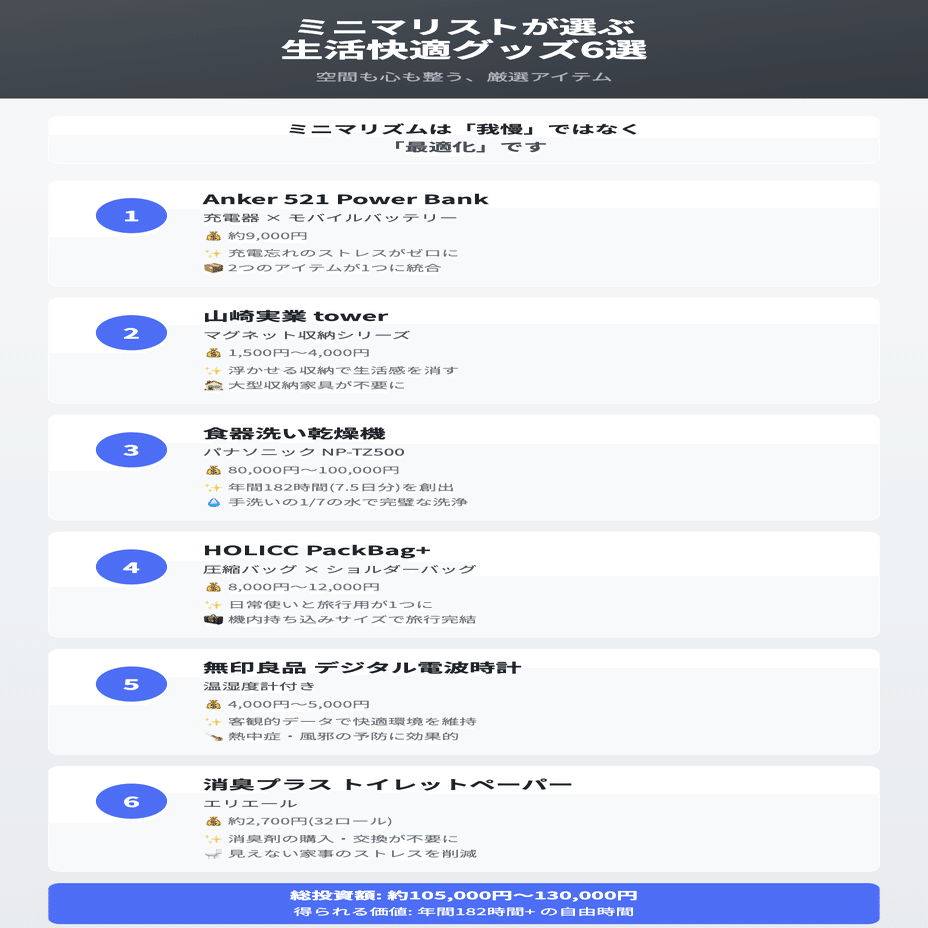 ミニマリズムは「我慢」ではなく「最適化」です。今回ご紹介した6つのグッズは、あなたの時間、空間、そして心の余裕を生み出す投資です。