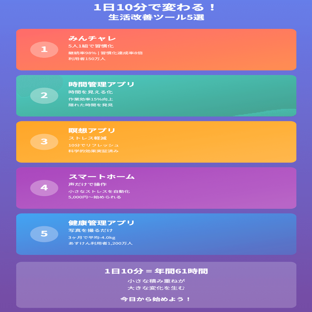 今回ご紹介するのは、忙しいあなたの生活を劇的に変える5つのツール。どれも1日10分程度で使えて、しかも効果は科学的に証明済み。最新のデータと実際の利用者の声をもとに、本当に役立つものだけを厳選しました。