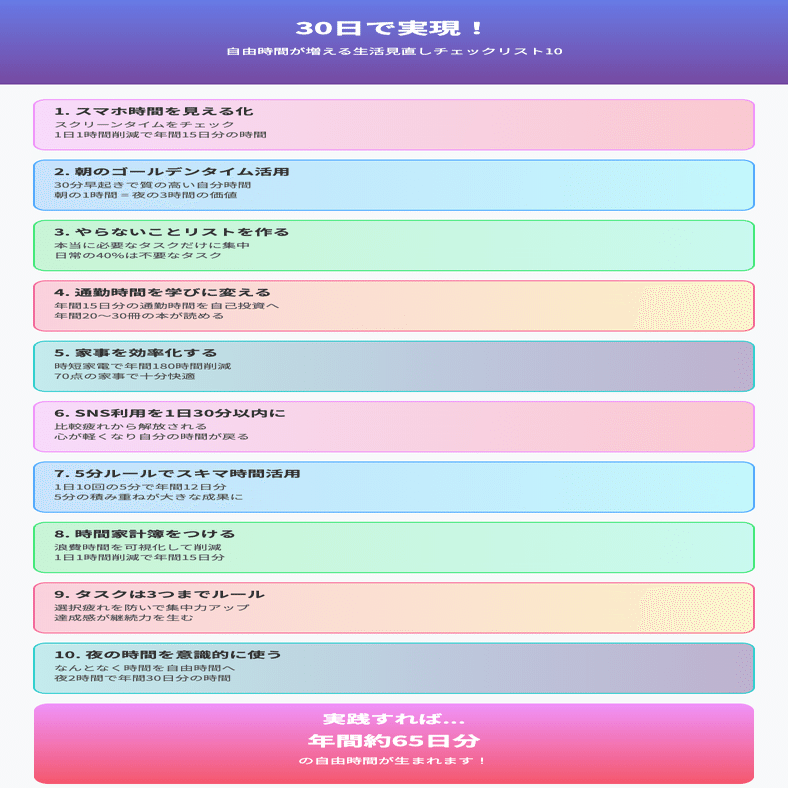 今日ご紹介する「生活見直しチェックリスト10」は、時間を”増やす”のではなく、今ある時間の”質”を変えることで、あなたの自由時間を取り戻す方法です。どれも今日から実践できる具体的な方法ばかり。30日後、あなたは「こんなに時間があったんだ」と驚くはずです。