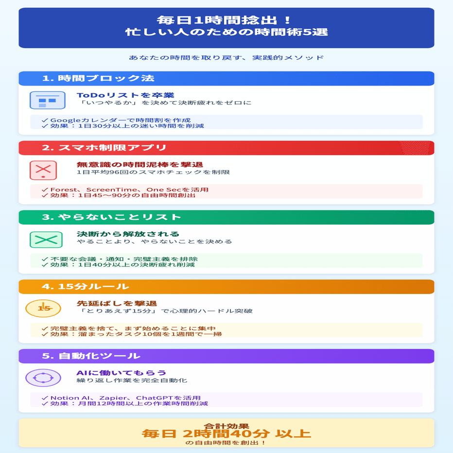 本記事では、誰でも今日から実践できる、科学的根拠に基づいた時間術を5つご紹介します。これらは私自身が実践し、実際に毎日1時間以上の自由時間を生み出した方法です。