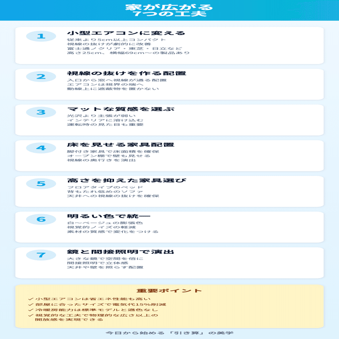 「部屋が狭い」という諦めは、視点を変えれば希望に変わります。間取りは変えられなくても、見え方は変えられる。その最初の一歩が、エアコンという「意外な盲点」に目を向けることなのです。