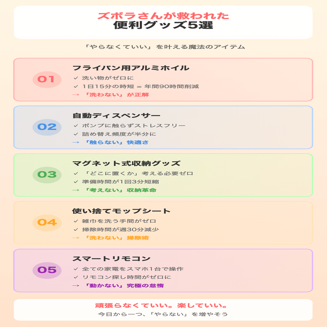 今日ご紹介するのは、「頑張らなくていい」「考えなくていい」「やらなくていい」を実現してくれる、ズボラさんのための便利グッズ5選。どれも、使ってみて「もっと早く知りたかった」と心から思ったものばかりです。
