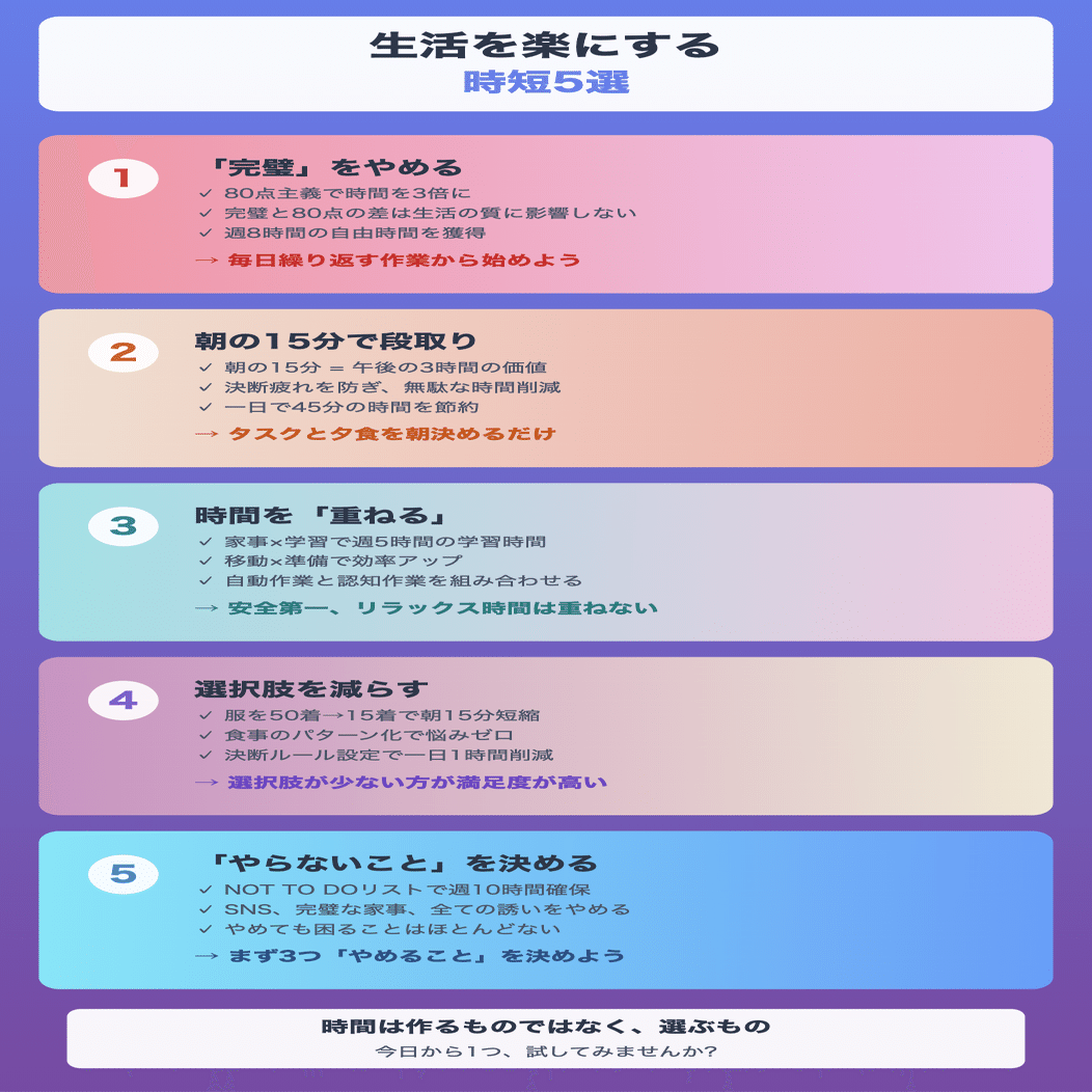今日お伝えする5つの方法は、単なる便利グッズの紹介ではありません。むしろ、あなたの生活に対する考え方そのものを変える、少し意外な方法です。実際、私自身がこれらを実践することで、毎日2〜3時間の自由時間を生み出すことができました。