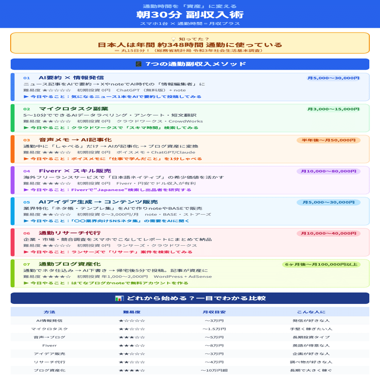 欧米では「コミュート・エコノミー(Commute Economy)」という考え方が広まっています。通勤中にポッドキャストを収録し、それを収益化する「コミューター・クリエイター」が増加。アメリカでは通勤時間を使ってFiverrやUpworkでスキルを販売し、月に数万円の副収入を得ているビジネスパーソンが珍しくありません。
