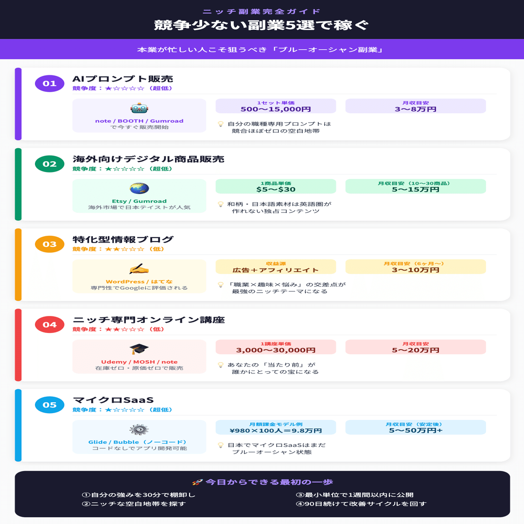 なぜ競争が少ないか: 日本語のプロンプト販売市場はまだ成長段階。特に「業種特化型プロンプト(例:不動産営業向け、医療事務向け、ECショップ向け)」はほぼ空白地帯です。