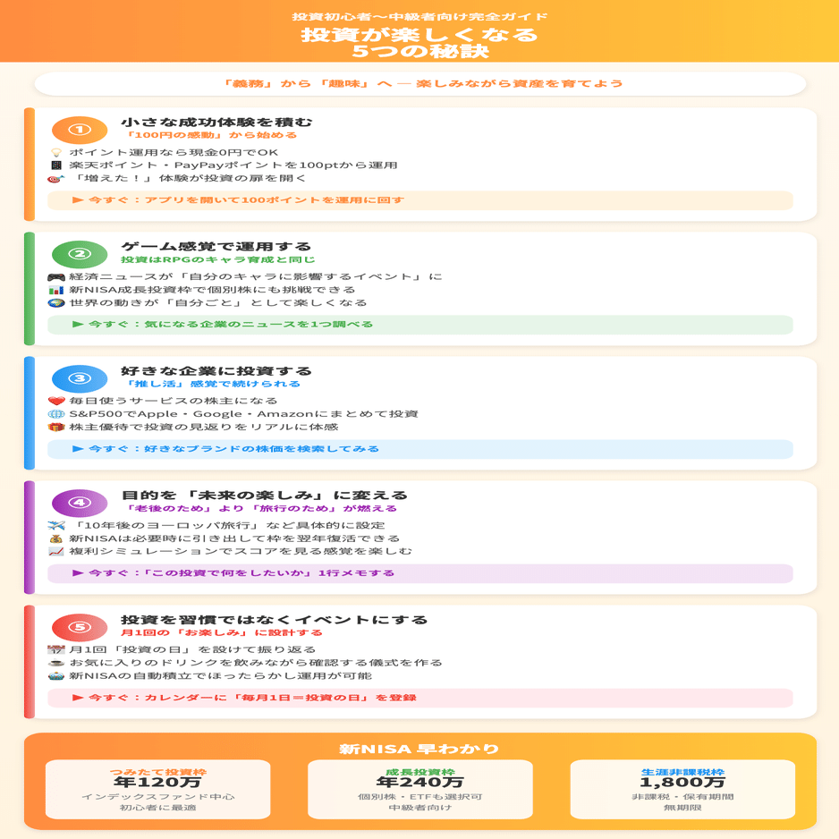 まずは今日、1つだけ行動してみてください。アプリを開く、ポイントを運用に回す、「投資の日」をカレンダーに登録する——どれか1つでいい。その小さな1歩が、楽しい投資習慣の入口になります。