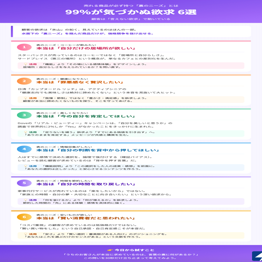 ステップ4:「裏ニーズ」を1行で書いてみる 「うちの顧客が本当に求めているのは、〇〇ではなく△△だ」というフォーマットで、自分のビジネスに当てはめてみよう。この1行が、商品設計からコピーまですべての軸になる。