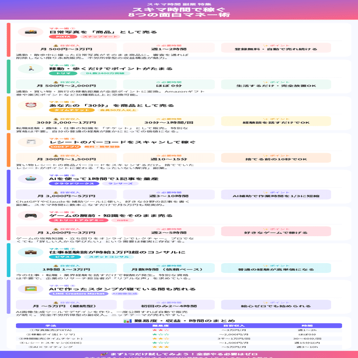 この記事で紹介するのは、**「あれ、気づいたら稼げてた」「これ、楽しくてやめられない」**という感覚になれる稼ぎ方ばかり。副業のためにがんばるんじゃなく、日常の延長線上にそっとお金が生まれてくるイメージです。