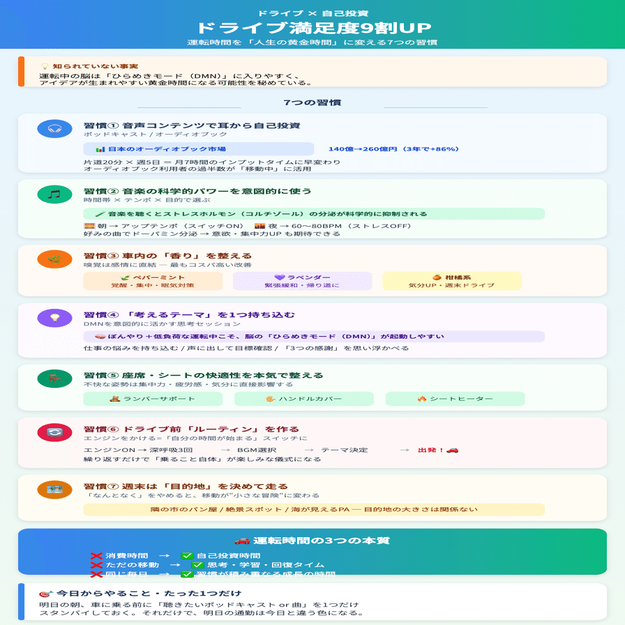 できます。しかもほぼコストゼロで。この記事では、脳科学・心理学のエビデンスをベースに、今日からすぐ試せる「ドライブ満足度を劇的に上げる7つの習慣」を紹介します。