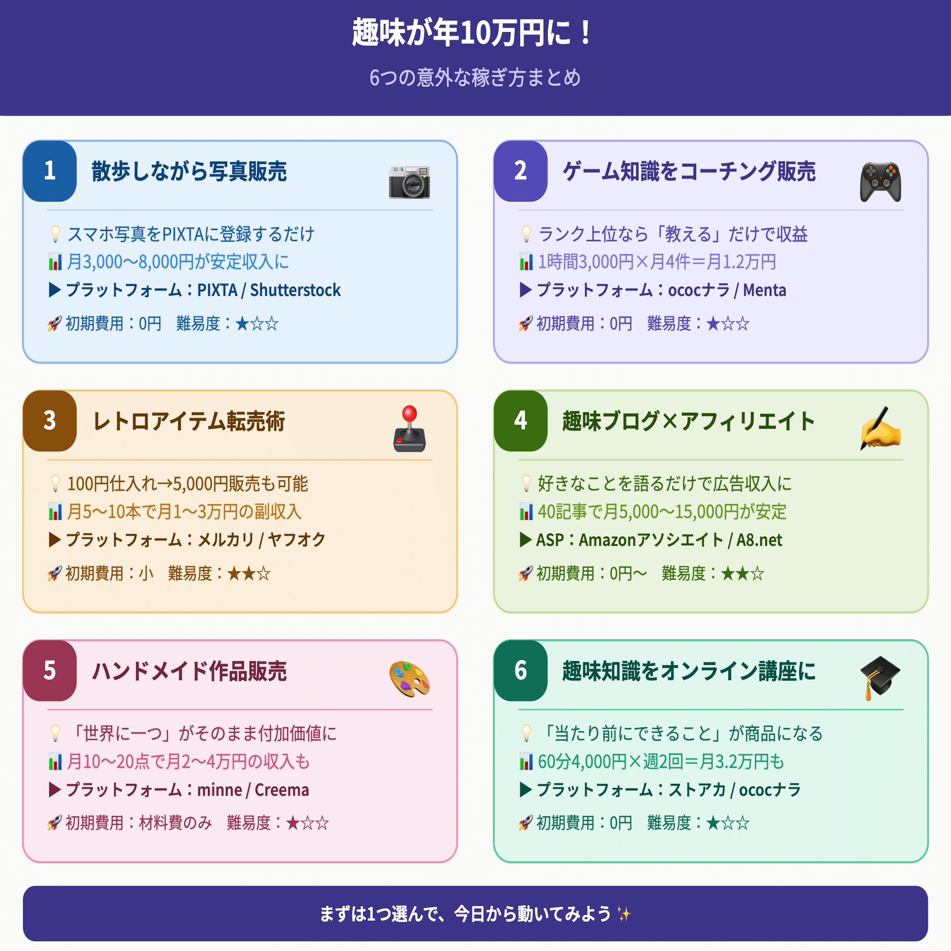 「楽しいこと」と「稼ぐこと」が重なる瞬間は、思っているより近くにあります。あなたの趣味は、すでに誰かにとっての価値を持っています。あとは、その価値を届ける「場所」に登録するだけです。