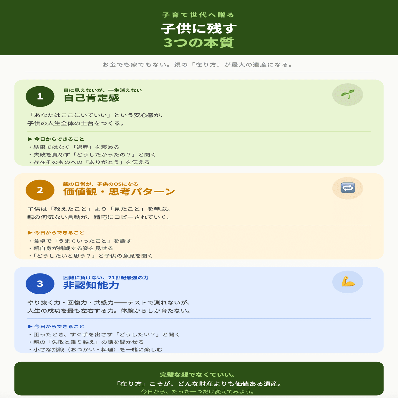 この記事では、親が子供に残せる「本当に大切な3つの本質」をお伝えします。読み終わったとき、きっと「知らないうちに、もうやっていた」と感じるはずです。そして、「今日から少しだけ意識を変えたい」という気持ちになっていただけたら、これ以上嬉しいことはありません。