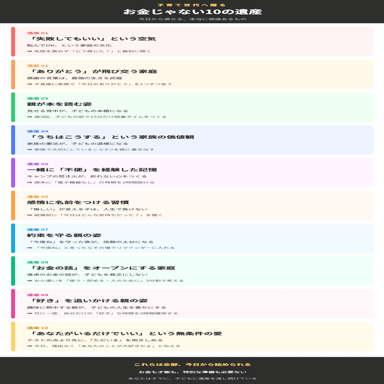 つまり親として子どもに残せる最大の遺産は、預金通帳の数字ではなく、毎日の何気ない言葉・行動・習慣の積み重ねなのです。