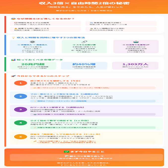 収入と自由時間を同時に増やすことは、決して夢物語ではありません。必要なのは「頑張る量を増やすこと」ではなく、「稼ぐ仕組みを変えること」です。