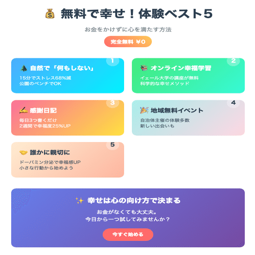 あなたの「無料で幸せ体験」があれば、ぜひコメント欄で教えてくださいね。みんなでシェアして、もっと豊かな毎日を作っていきましょう!