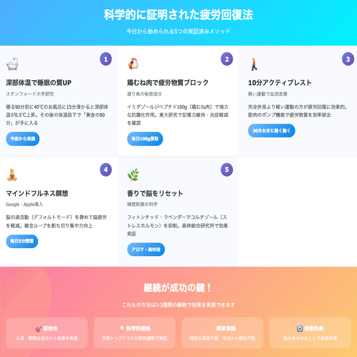 今回の記事では、世界トップクラスの研究機関や医療現場で実証された5つの疲労回復法をご紹介します。どれも今日から試せるものばかりです。