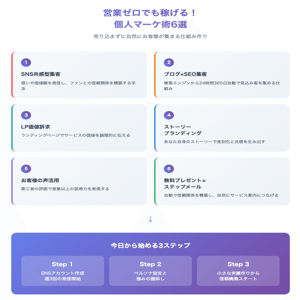 今の時代、営業ゼロでも稼げる個人マーケティング術が確実に存在します。実際に私も営業が大の苦手でしたが、これから紹介する6つの手法を実践することで、お客さんの方から「ぜひお願いします!」と言ってもらえるようになりました。