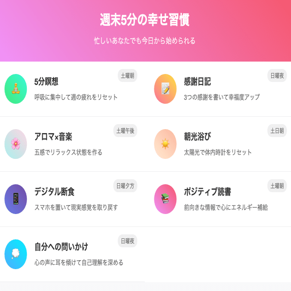 推奨SEOキーワード: 幸せ習慣 / 週末リラックス方法 / 5分でできるセルフケア / 豊かな生活習慣 / 忙しい人向けマインドフルネス / 自己肯定感上げる方法 / ミレニアルセルフケア