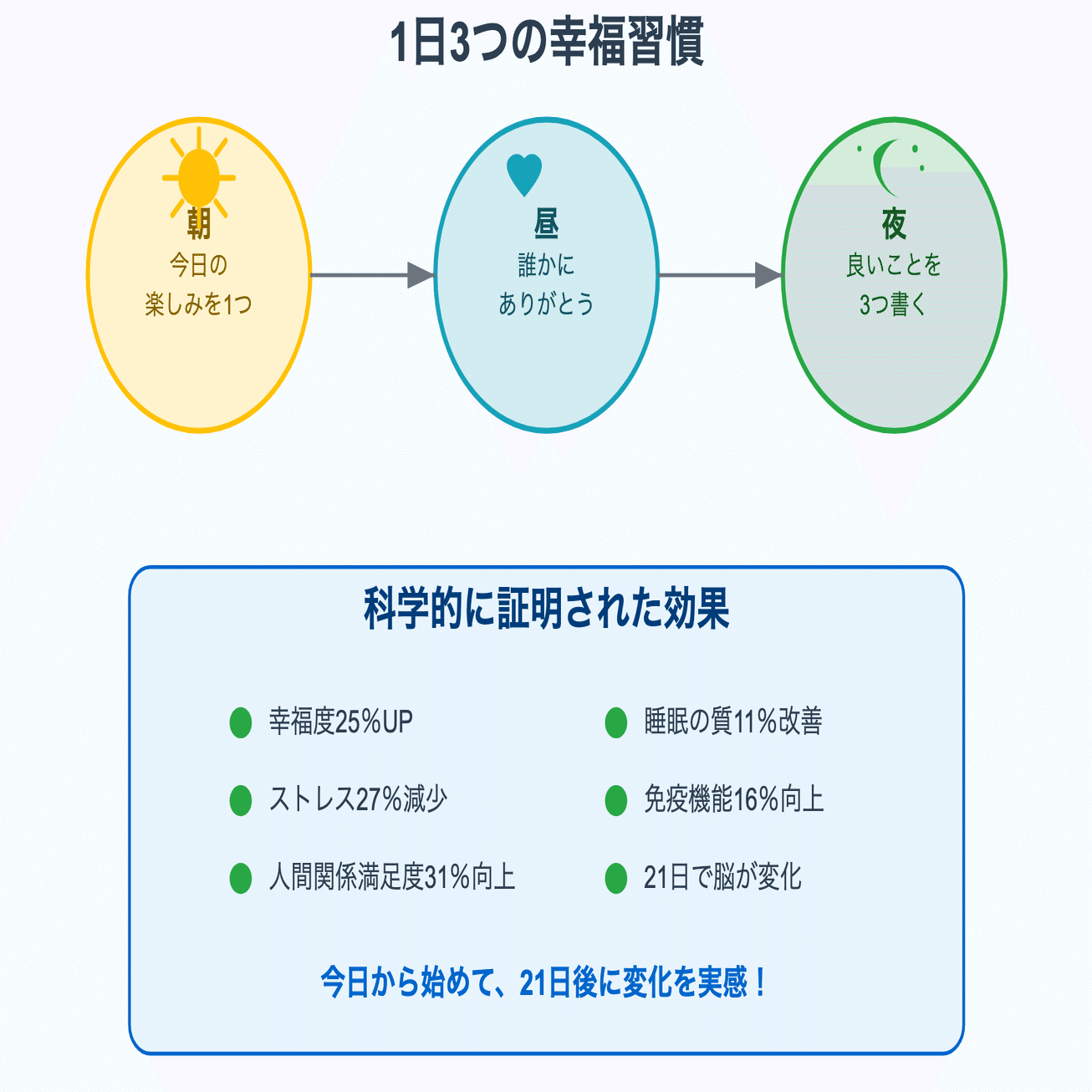 この3つが揃った「1日3つの幸福習慣」を、ぜひ今日から試してみてください。