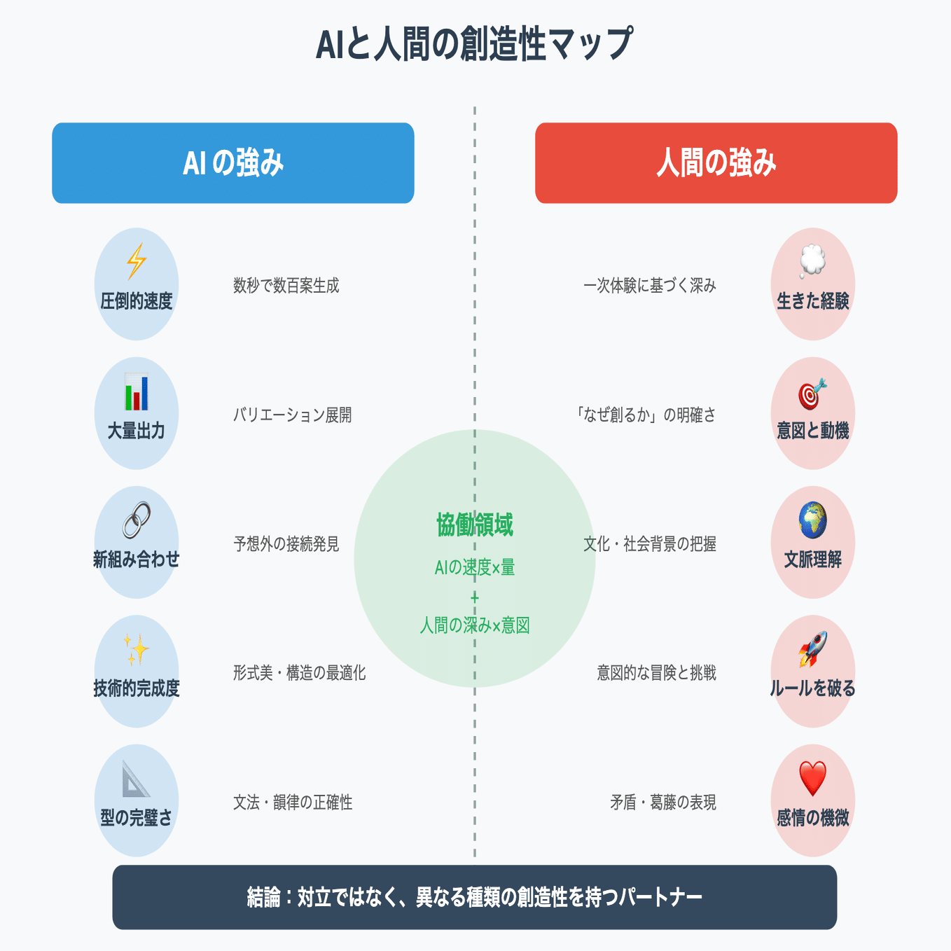 これまでの10の実験から見えてきた、人間とAIの創造性の違いを整理しましょう。