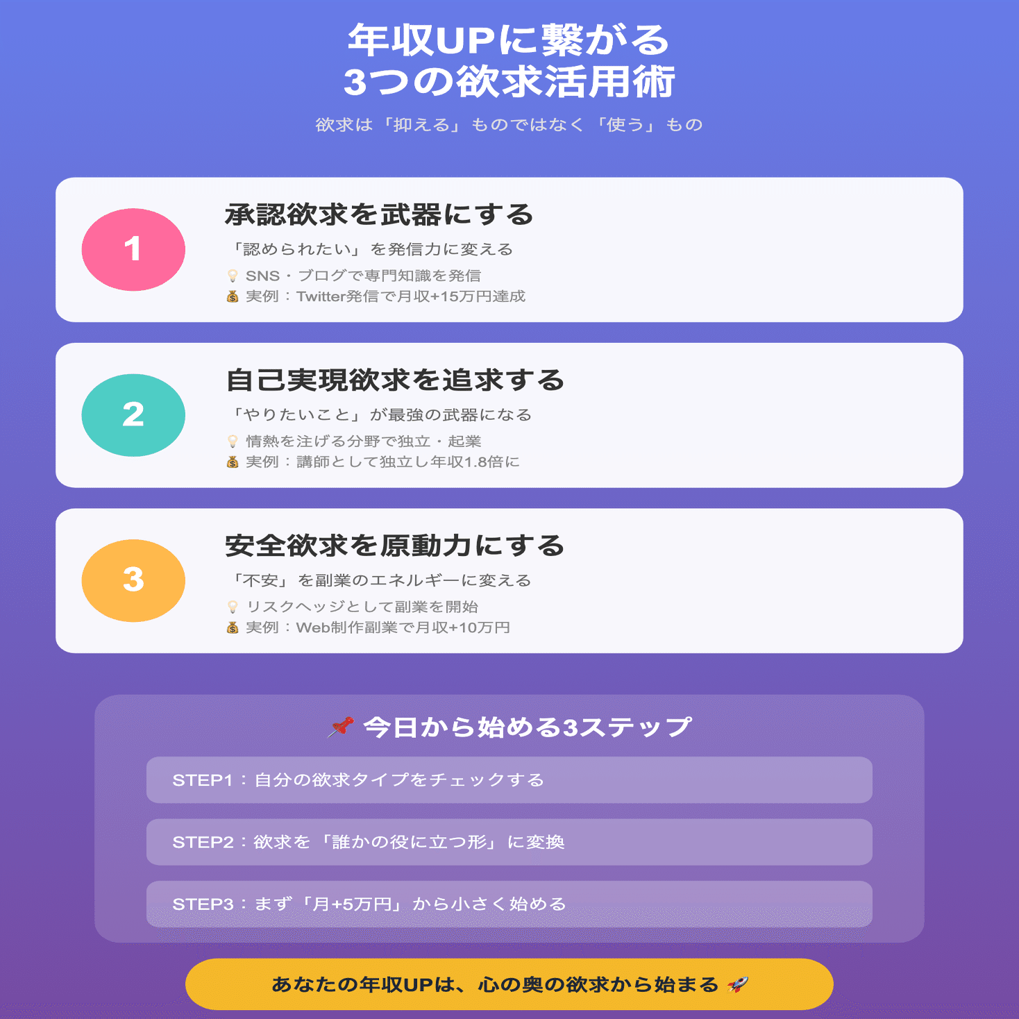 承認欲求、自己実現欲求、安全欲求。どれも人間として自然な感情です。それを否定するのではなく、ビジネスの原動力として活かす——それが、年収アップの最短ルートなのです。